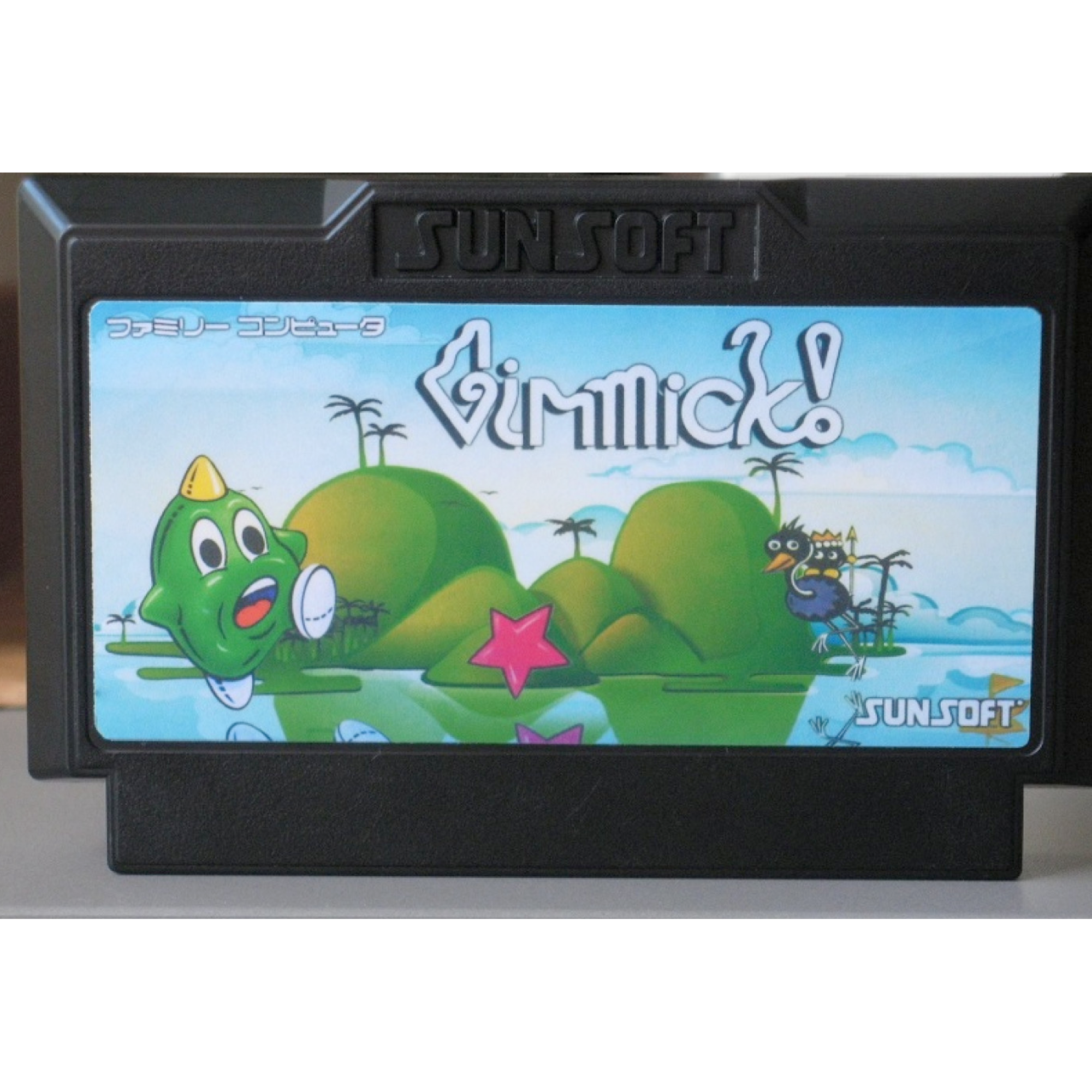 En svart Sunsoft Famicom-kassett, där vi lägger på en repro av den amerikanska, inofficiella versionen.