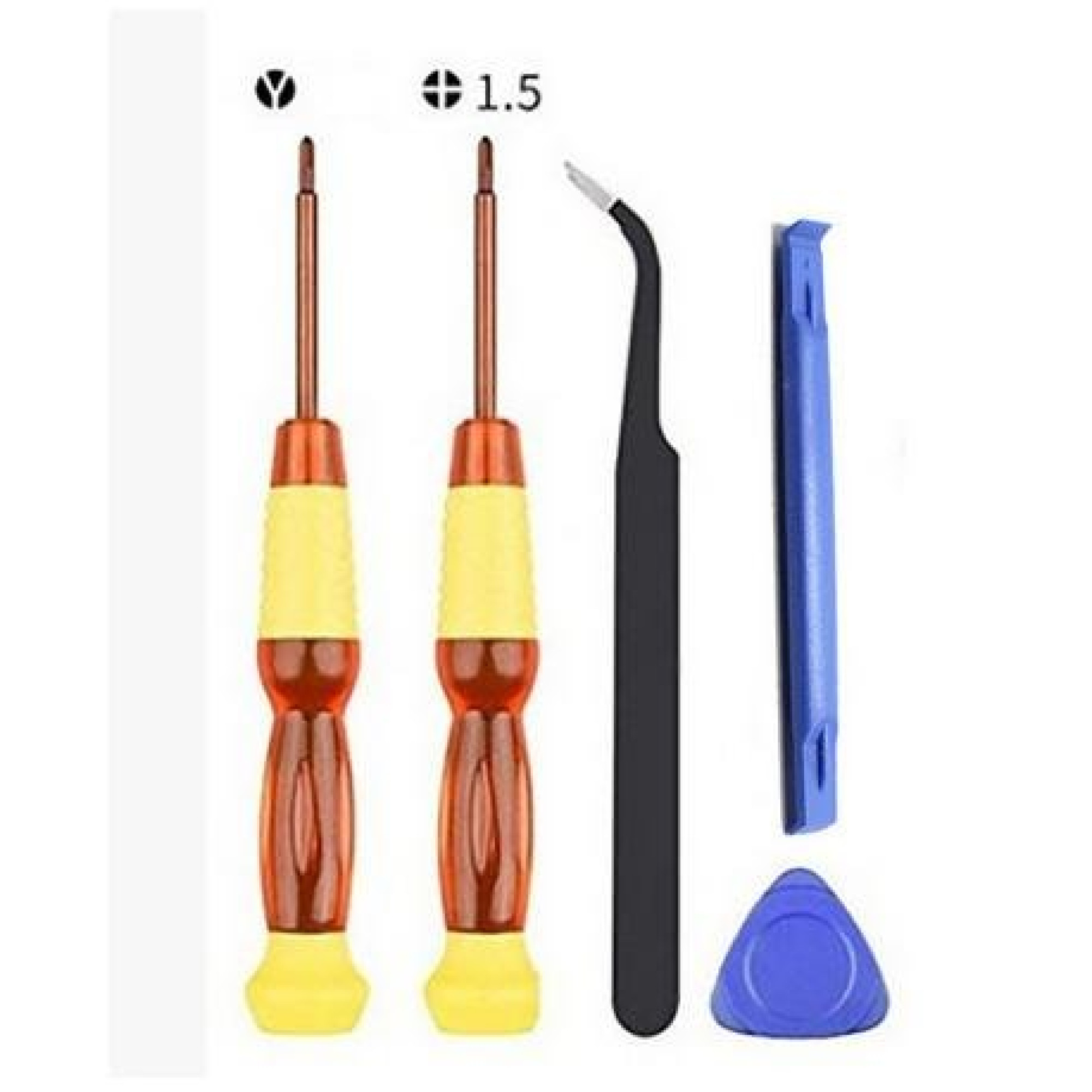 Inkluderar två skruvmejslar, pincett och plastbit för att öppna.