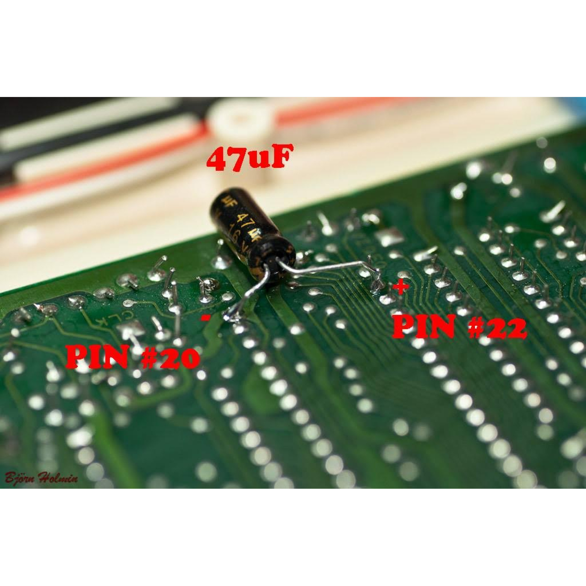 Extra kondensator som kan sätta undertill på PPUn för att få bort vertikala ränder i bild. Se bild. Kondensatorn är på 220 uF, ej 47. (ej med på foto)